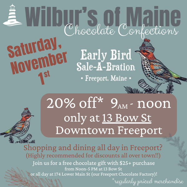 Enjoy 20% off your entire in-store, in-stock purchase at our Early Bird celebration November 1st at our 13 Bow St. Downtown Freeport location from 9am - Noon! Can't make it early? Keep the fun going with a free chocolate gift when you spend over $25 from Noon - 5pm at 13 Bow St. or all day at our Freeport Chocolate Factory, 174 Lower Main St.! All discounts apply to in-stock, in-store merchandise only and cannot be applied to previous purchases, wholesale … Continued