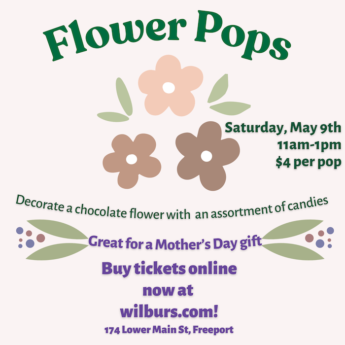 FeaturedWilbur's of Maine Factory 174 Lower Main St, Freeport, ME, United StatesSelect, prepare, and decorate a chocolate pop in the shape of a flower! A perfect gift for the special mom in your life, or to eat for yourself! Includes a demonstration of the chocolate mold filling process. Saturday, May 9th from 11am - 1pm. $4 per pop Tickets can be purchased in advance here. There may be walk in availability on the day of the event but pre-purchasing tickets will secure your pizza and time slot.