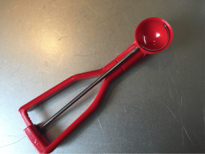 Lay out your cookie sheets-now is not the time for parchment! We want a golden bottom on these cuties so ungreased cookie sheets will do. Then, you need a scoop.
