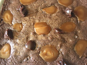 Ours are about ½ Tbsp. size. Think making little pools of caramel. Continue baking another 10-15 minutes or until a toothpick inserted into the brownie portion has only small crumbs or is clean.