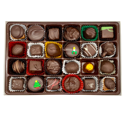 This is a Christmas themed assortment of your favorite chocolates- all enrobed in dark chocolate! Creams, Tom’s Terrifics, Needhams, caramels, peanut butter cup, nut clusters and meltaway truffles just to name a few.