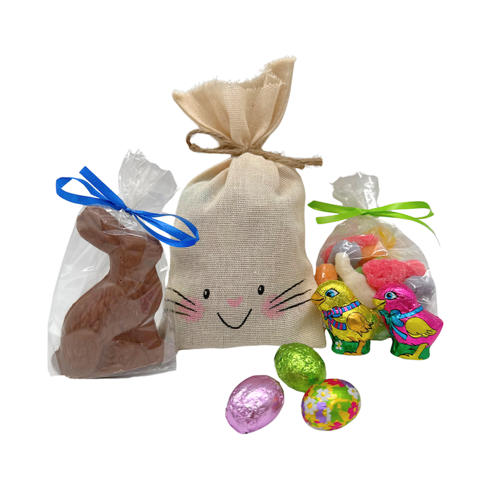Tucked inside this adorable burlap bunny bag you will find a Milk Chocolate Lily bunny, 3 Milk chocolate foil eggs, 2 Milk chocolate foil chicks and a small bag of sanded gummi bunnies.