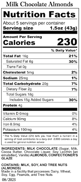 Fresh and crunchy almonds covered in rich all-natural chocolate. A simple, but decadent flavor combination. Available in your choice of Milk or Dark Chocolate.