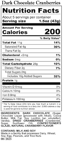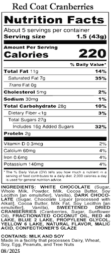 Dried Cranberries covered in either Dark Chocolate or Red Coated (white chocolate tinted red covering dark chocolate).