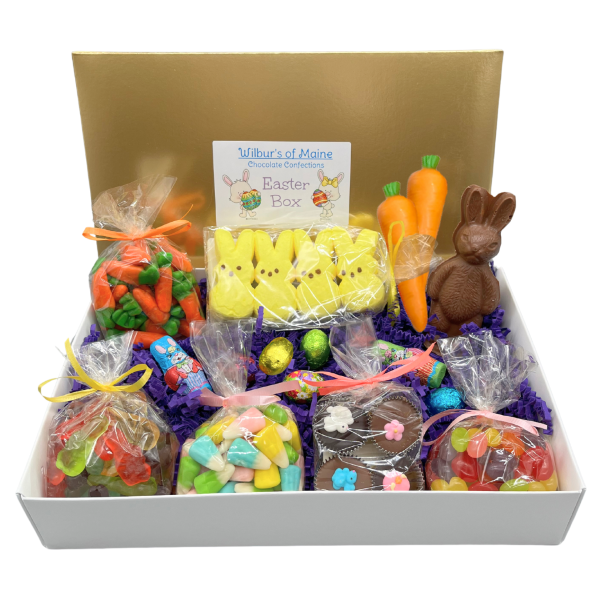 Easter goodies packed in a gold top box. Includes 1 milk chocolate Harvey bunny, 1 row of marshmallow Peeps, 2 pack of orange creamsicle flavored white chocolate carrots, 4 pack of Easter Genevas (milk and dark chocolate with sugar decoration), 4 oz. Albanese gummi bunnies, 4 oz. orange flavored gummi carrots, 4 oz. Easter candy corn, 4 oz. jelly beans, 2 milk chocolate foil bunnies and 4 milk chocolate foil eggs.