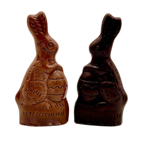 This small, lovable bunny nestles an easter egg at his feet. Traditional look, solid chocolate and the perfect addition to any basket. Weighs approximately 3 oz.