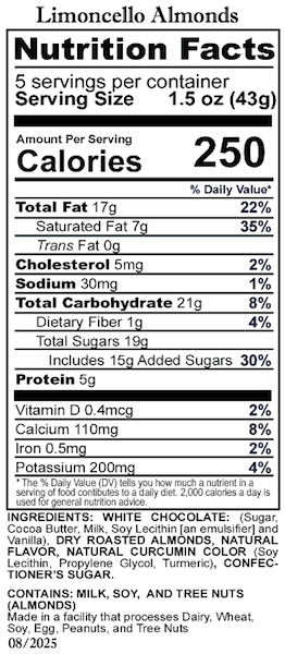 Zesty lemon flavored creamy chocolate and crunchy roasted almonds-this is one you’ve got to taste to believe! 8 oz. bag