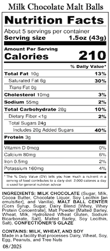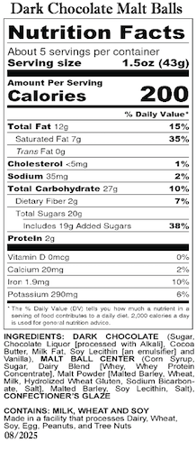 These aren’t your movie theatre malt balls! We start with a crisp, crunchy malt ball center and cover them in a thick layer of our delicious milk or dark chocolate. The ratio of smooth chocolate to crunchy center will leave you wondering how you ever watched a movie without them.