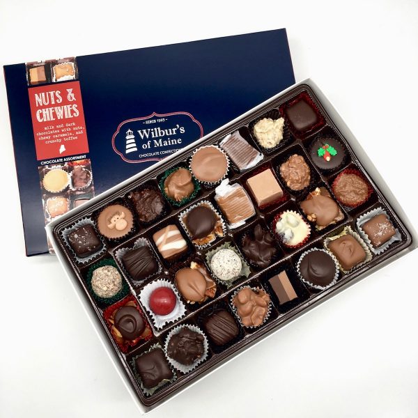 Nuts and Chewies is a selection of just that: milk and dark chocolates with nuts, chewy caramels, and crunchy toffee. Some chocolates included: pecan and cashew Terrifics, nut clusters, panned almonds, caramels, coconut clusters and our ever popular buttercrunch. This crowd pleasing assortment is beautifully presented in our handsome blue “Nuts and Chewies” gift box. Perfect for the nut lover in your life. Choose a 32 Piece Box or a 64 Piece Box.