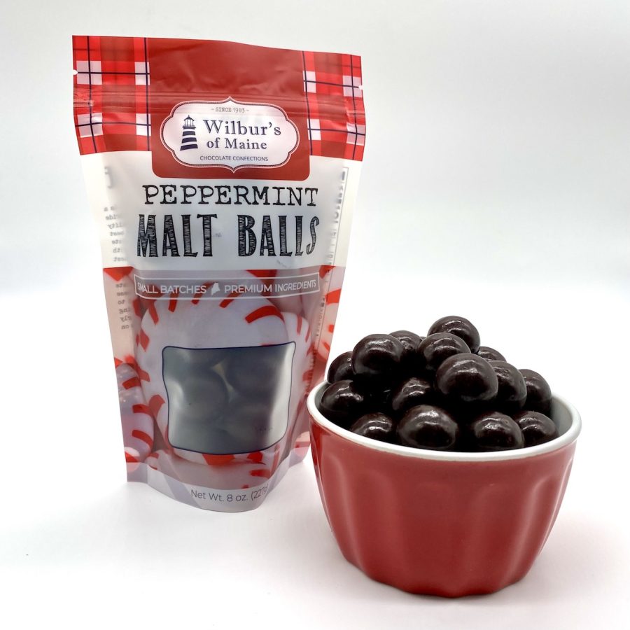 Our dark chocolate malt balls with cool, crisp, peppermint flavor. 8 oz. bag