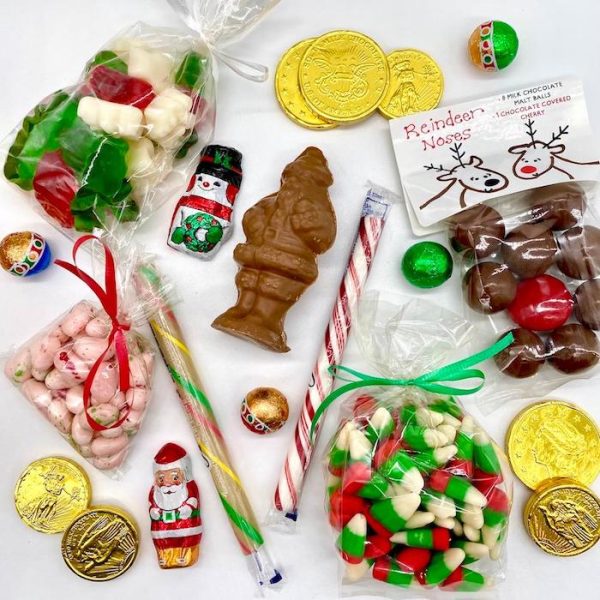 Contains: 1 milk chocolate “Jolly Santa,” 4 oz. holiday gummis, 4oz Jelly Belly Christmas Jelly Beans, 1 bag of gold coins, 1 package of “reindeer noses” (malt balls and cherry), Milk chocolate foils- Santa, snowman and ornament balls, and 2 candy sticks.
